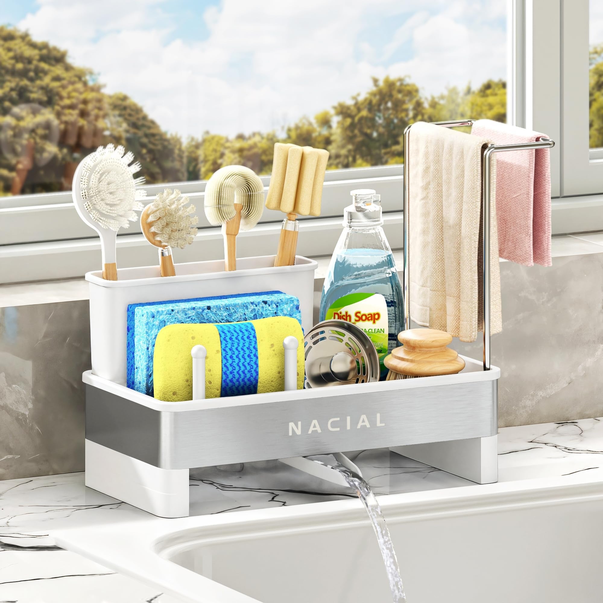 • Capacity: Holds soap dispenser, sponge, sink stopper, scrubbers, and small accessories